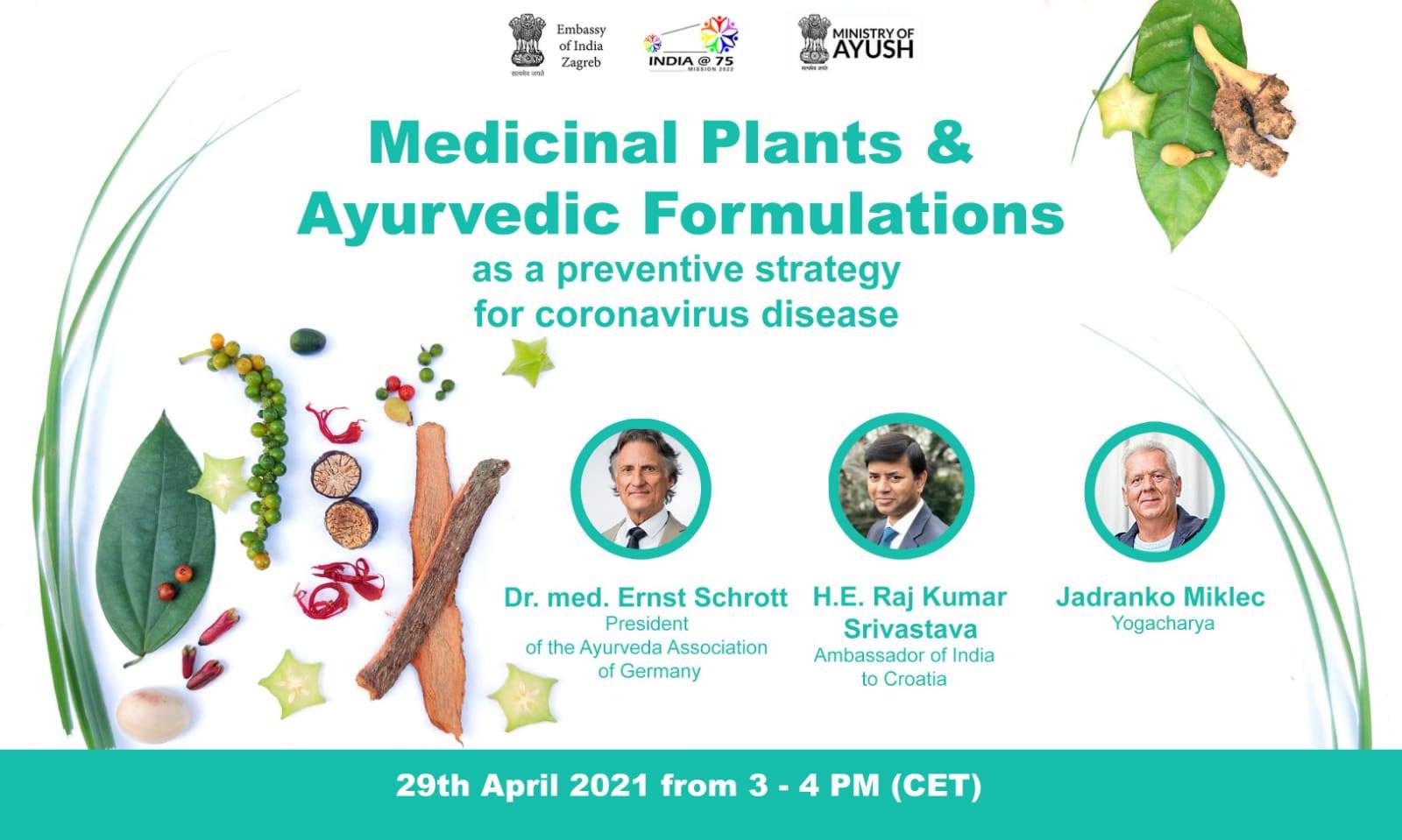 Webinar on “Medicinal Plants & Ayurvedic Formulations as a preventive strategy for coronavirus disease” with Yogacharya Mr. Jadranko Miklec, H.E. Ambassador Raj Kumar Srivastava & Dr. Ernst Schrott, Vice President of Deutsche Ayurveda Gesellschaft.