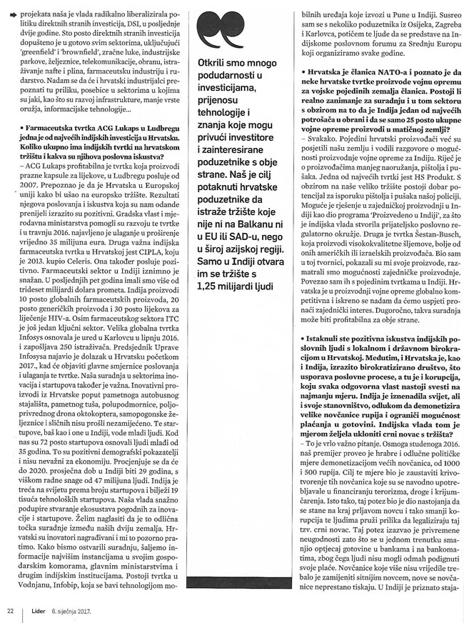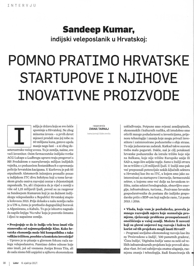 Ambassador‘s Interview in Lider Magazine on building bilateral relations between India and Croatia. (05.01.) Translated version: http://bit.ly/2iORQfu (English)